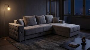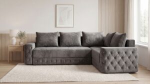 Ugaona garnitura Glorija odiše elegancijom i komforom, predstavljajući idealan izbor za savremene enterijere. Njen prostran dizajn i pažljivo oblikovane linije pružaju osećaj luksuza i udobnosti, čineći je savršenim mestom za opuštanje i svakodnevno uživanje.
